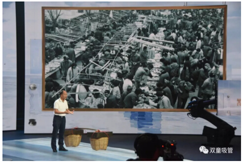 在節(jié)目現(xiàn)場(chǎng),“雙童”樓仲平也帶來(lái)了許多精彩的照片。其中,開(kāi)場(chǎng)照片便是義烏這座城市的對(duì)比照片。通過(guò)挑貨郎與義烏小商品城開(kāi)展全球電商的照片對(duì)比,樓仲平講述了義烏如何從貧瘠落后的小縣城發(fā)展為全球最大的小商品集散中心的故事……