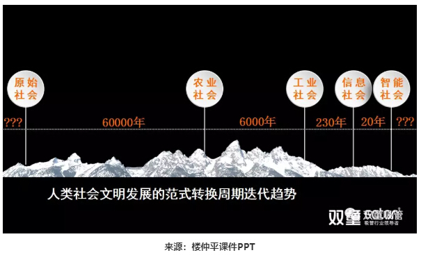 從這頁PPT中,我們可以看到,人類從原始社會(huì)過渡到農(nóng)業(yè)社會(huì),經(jīng)歷了60000年;從農(nóng)業(yè)社會(huì)過渡到工業(yè)社會(huì),經(jīng)歷了6000年;從工業(yè)社會(huì)過渡到信息社會(huì),經(jīng)歷了230年;而從信息社會(huì)過渡到智能社會(huì),人類僅僅需要20年。這說明在人類社會(huì)文明發(fā)展的過程中,范式轉(zhuǎn)換的周期變得越來越短。
