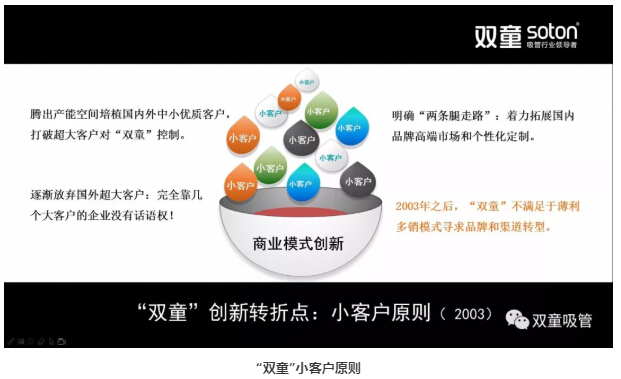 于是,“雙童”逐步爭(zhēng)取到了大量原被忽視的小客戶群體,這樣一來(lái),使“雙童”有效地降低了部分客戶過(guò)于集中所帶來(lái)的企業(yè)風(fēng)險(xiǎn),從而牢牢掌握企業(yè)經(jīng)營(yíng)的主動(dòng)權(quán)!