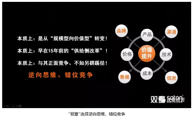 實(shí)際上,“雙童”推動(dòng)此次改革就是讓企業(yè)從“規(guī)模型向價(jià)值型”轉(zhuǎn)變,從而打破原來(lái)產(chǎn)業(yè)的邊界,拓展了原本產(chǎn)業(yè)內(nèi)被忽視的顧客群體和顧客需求,這本質(zhì)上就是錯(cuò)位競(jìng)爭(zhēng),與其正面競(jìng)爭(zhēng)、不如另辟蹊徑!這也正是迎合了近年來(lái)不斷被提倡的“供給側(cè)改革”,無(wú)非是“雙童”早做了15年。