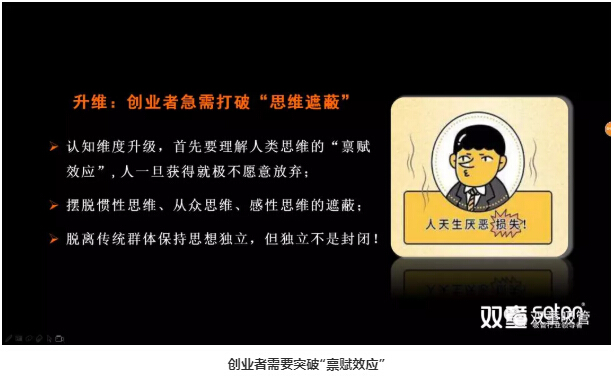 明白了何為“稟賦效應(yīng)”以后,我們就不難理解,樓仲平為何會(huì)在課程中一再?gòu)?qiáng)調(diào),創(chuàng)業(yè)者需要打破慣性思維、從眾思維、感性思維的“思維遮蔽”,突破“稟賦效應(yīng)”,脫離傳統(tǒng)群體保持思想獨(dú)立,從而實(shí)現(xiàn)認(rèn)知升維!
