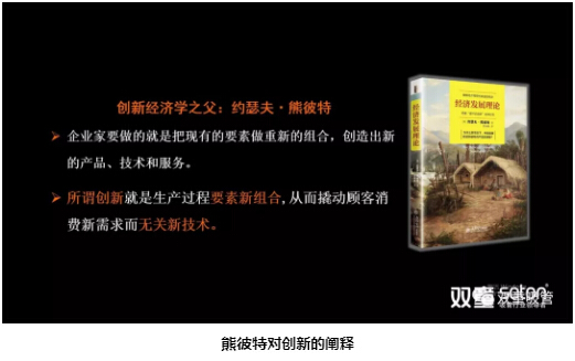 創(chuàng)新經(jīng)濟(jì)學(xué)之父約瑟夫·熊彼特,曾在其著作《經(jīng)濟(jì)發(fā)展理論》中對(duì)“創(chuàng)新”做了重新定義:所謂創(chuàng)新就是生產(chǎn)過(guò)程中的要素新組合,從而撬動(dòng)顧客消費(fèi)新需求而無(wú)關(guān)新技術(shù)。企業(yè)家要做的就是把現(xiàn)有的要素做重新的組合,創(chuàng)造出新的產(chǎn)品、技術(shù)和服務(wù)。其本質(zhì)就是所謂的創(chuàng)新。