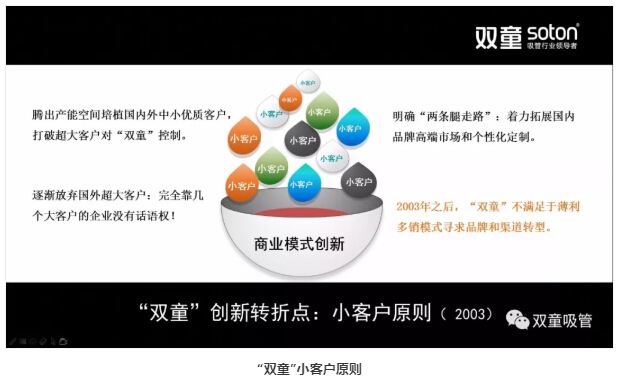 于是,“雙童”逐步爭取到了大量原被忽視的小客戶群體,這樣一來,使“雙童”有效地降低了部分客戶過于集中所帶來的企業(yè)風(fēng)險(xiǎn),從而牢牢掌握企業(yè)經(jīng)營的主動(dòng)權(quán)!