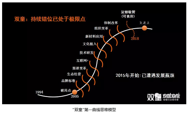 上述思維模型是“雙童”從1994年起步,但在2005年遭遇了發(fā)展瓶頸,雖然通過后續(xù)各個(gè)時(shí)期的錯(cuò)位競爭,不斷創(chuàng)新一步步堅(jiān)持到現(xiàn)在,但是“雙童”的今天已是持續(xù)錯(cuò)位到了極限點(diǎn)的狀態(tài),已經(jīng)遇到天花板。
