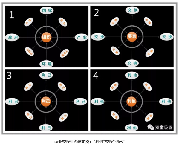 正如下圖的思維模型中所展示:組織在發(fā)展過程中,會與環(huán)境、產業(yè)、政府、國家等宏觀社會產生鏈接,而人與他人(天下萬物)之間也存在彼此交換的過程,你對員工、社會、環(huán)境、資源的態(tài)度,換取了“他人”對你的態(tài)度,這本質上雙方出于“利己”的目的,但同時又給對方創(chuàng)造了價值,讓雙方都有所獲得,從而最終實現(xiàn)了“利他”。