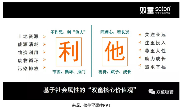 以“雙童”為例:“雙童”樓仲平一直以來深受日本文化的影響,因此,經營“雙童”26年的過程中,不斷的轉變,不斷的放棄,不愿做一家只能掙錢的大公司,而希望做一家有利于行業(yè)、有利于社會、有利于環(huán)境生態(tài)的好公司。