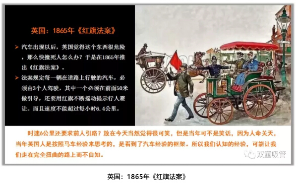 1865年,由于懼怕汽車速度過快撞到行人,英國議會出于安全考量通過了一部《機動車法案》,即后來被人嘲笑的《紅旗法案》。在這部法案中規(guī)定:每一輛在道路上行駛的機動車,必須由3個人駕駛,其中一個必須在車前面50米以外做引導,還要用紅旗不斷搖動為機動車開道,并且速度不能超過每小時4英里(每小時6.4公里)。