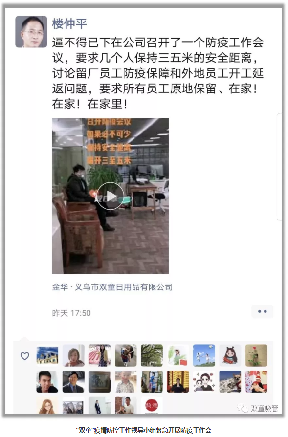 面對新型冠狀病毒感染的肺炎疫情,“雙童”也在第一時間響應(yīng)政府號召,向員工們發(fā)出了關(guān)于做好當前疫情防控工作的倡議書,緊急開展防疫工作會議,讓所有員工在家休息,緩返義烏!
