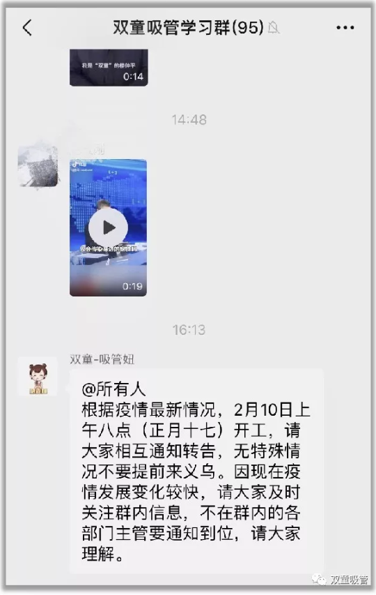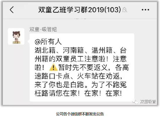 “雙童”微信群不斷發(fā)出公告,提醒所有員工延返義烏,何時回公司上班根據(jù)疫情控制而定,對于湖北籍員工,在家期間工資照發(fā),一分不扣,給員工們吃下了定心丸。