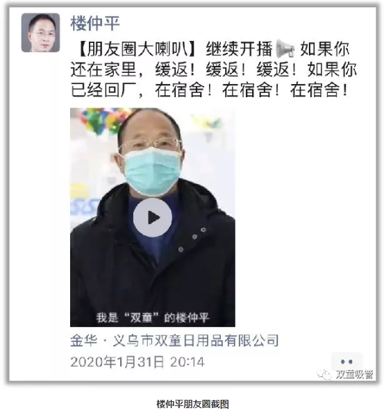 “雙童”樓仲平則當起了朋友圈大喇叭,不斷提醒員工們緩返義烏,在家休息,不要輕信并傳播謠言。