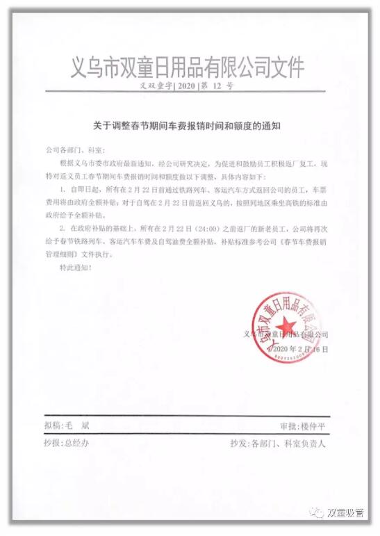 隨著新型冠狀病毒肺炎疫情進入新階段,為了全面推動企業(yè)復(fù)工復(fù)產(chǎn),義烏政府出臺了多項保障政策!為了盡快全面恢復(fù)生產(chǎn),“雙童”也響應(yīng)號召,加大對員工的招引力度,用一系列誘人的補貼獎勵政策吸引和推動新老員工返廠復(fù)工!