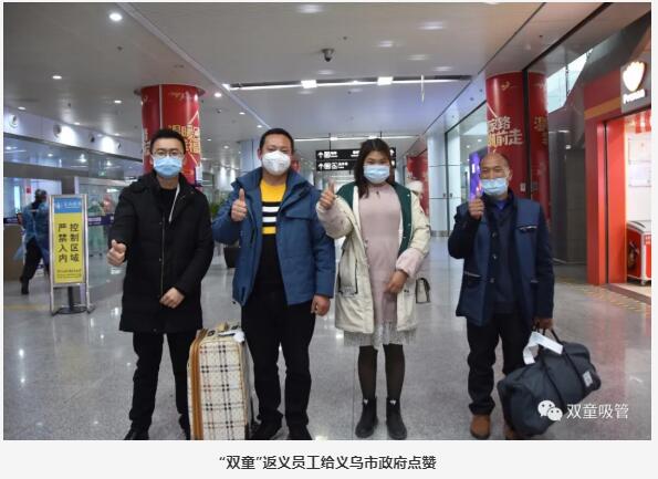 對(duì)于義烏市政府幫企業(yè)接回員工,“雙童”李二橋在接受義烏電視臺(tái)記者采訪時(shí)表示:“‘雙童’有5位員工乘坐了本次航班,涉及技術(shù)、司機(jī)、成型工等重要崗位。