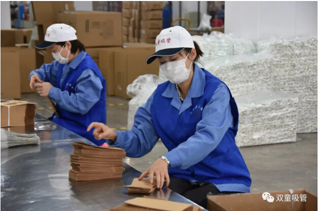 從2月25日開始,上崗的工會機(jī)關(guān)干部、婦聯(lián)志愿者相繼來到“雙童”,經(jīng)過測量體溫、消毒登記、查看健康碼、更衣?lián)Q帽等一系列防疫流程后,進(jìn)入了包裝車間。