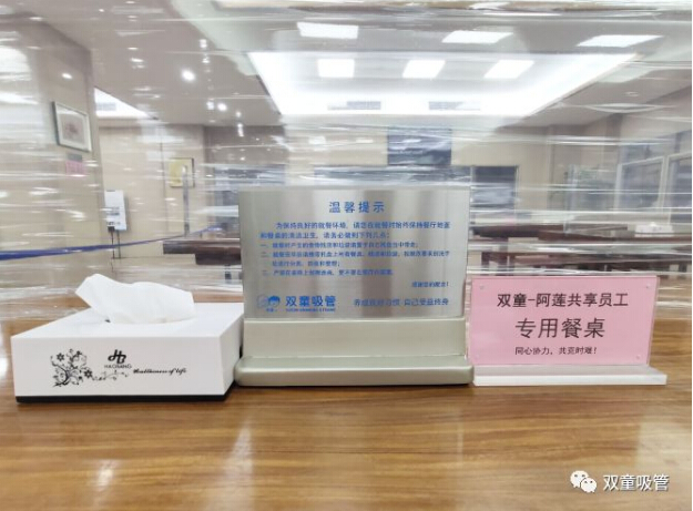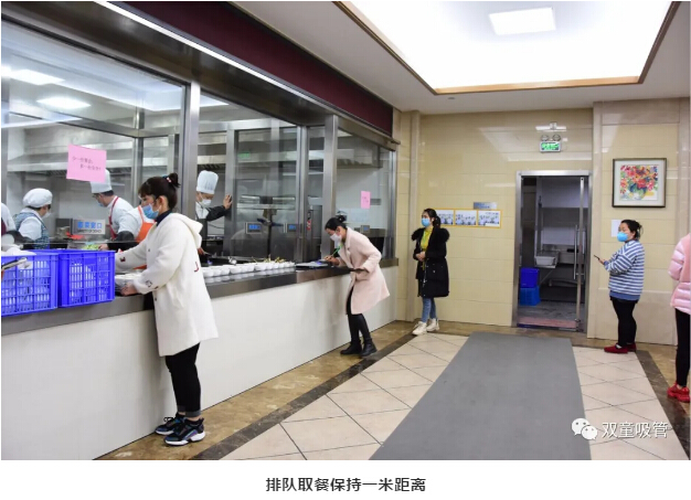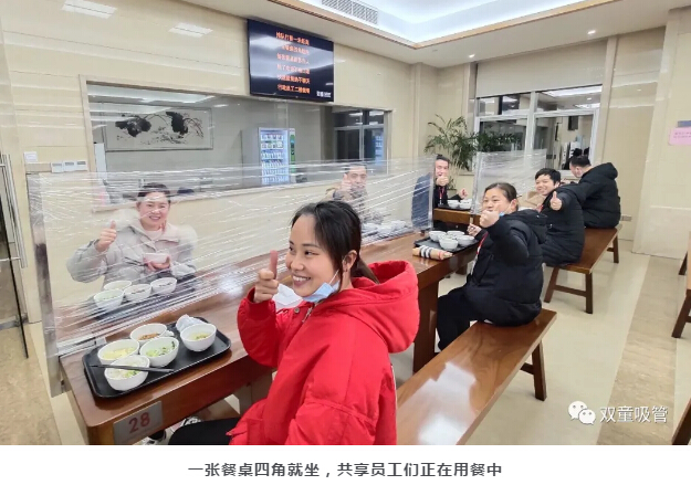 為了讓“共享員工”安心在企業(yè)工作,“雙童”也免費(fèi)提供“兩葷一素”標(biāo)準(zhǔn)的中餐與晚餐。疫情下,為了安全起見,“雙童”特地規(guī)劃出共享員工的專屬餐桌,座位之間用保鮮膜隔板隔開,同時(shí)也引導(dǎo)大家排隊(duì)取餐保持一米距離,餐桌四角就坐,讓大家放心就餐。