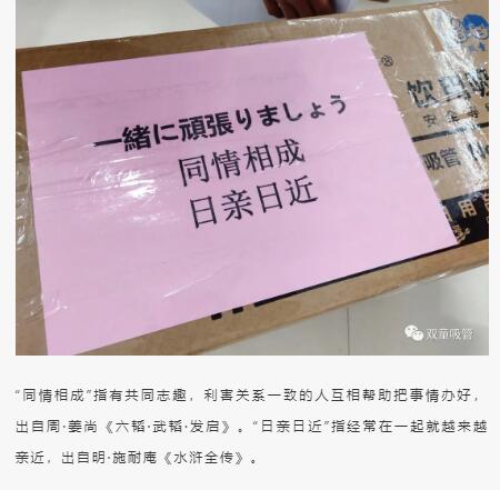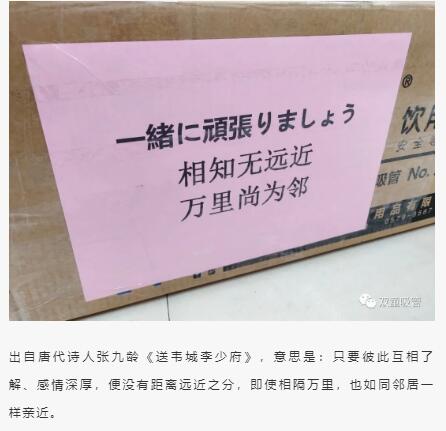 于是,吸管妞在這次援助日本友人的物資包裝箱上同樣也相贈了“相知無遠近,萬里尚為鄰”、“同情相成,日親日近”等詩句,以表達我們對日本友人的友好之情。