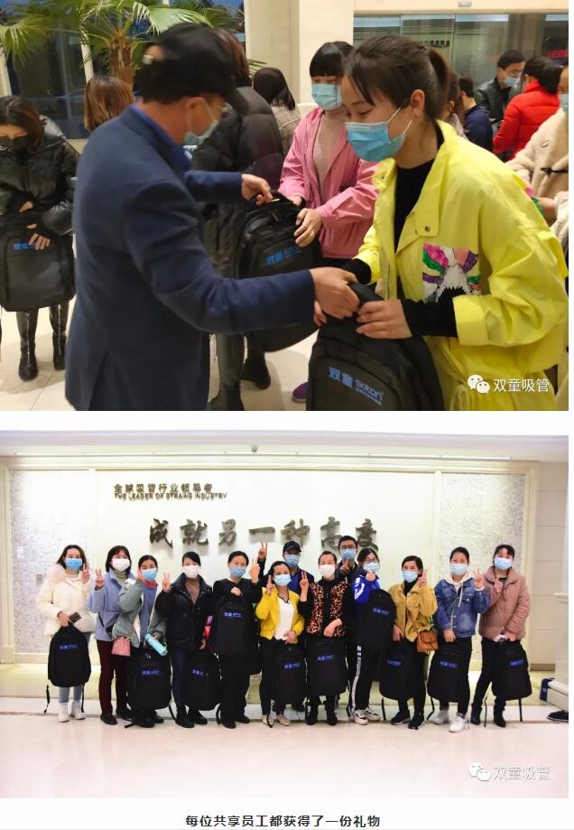 由于時(shí)間比較倉(cāng)促,吸管妞原本準(zhǔn)備的鮮花、零食禮包等禮品都還未到位,但是依舊為大家送上了非常有紀(jì)念意義的“雙童”定制背包和企業(yè)文化叢書(shū)。