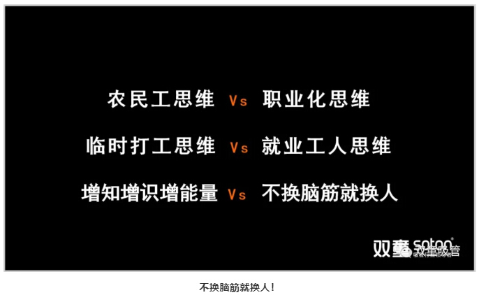 那么,“更換腦筋”就是要讓管理者從“農(nóng)民工思維”轉(zhuǎn)換為“職業(yè)化思維”,從“臨時(shí)打工思維”轉(zhuǎn)換為“就業(yè)工人思維”,徹底改變管理者“有事找領(lǐng)導(dǎo)、解決等指令”的惰性家長(zhǎng)式管理方式,提高團(tuán)隊(duì)尋找問(wèn)題、發(fā)現(xiàn)問(wèn)題以及主動(dòng)解決問(wèn)題的能力,從而提升組織效率,以適應(yīng)這個(gè)不斷變化的時(shí)代。