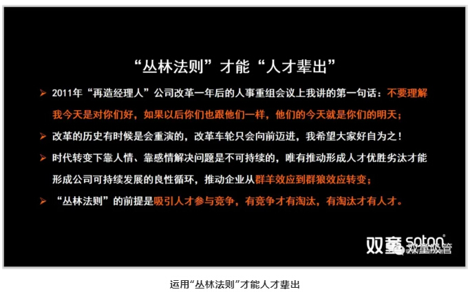 如今時(shí)代轉(zhuǎn)變下,靠人情、感情解決問(wèn)題是不可持續(xù)的,唯有吸引人才參與競(jìng)爭(zhēng),推動(dòng)人才優(yōu)勝劣汰,才能形成公司可持續(xù)發(fā)展的良性循環(huán),推動(dòng)企業(yè)從群羊效應(yīng)到群狼效應(yīng)轉(zhuǎn)變。所以,公司里的每一個(gè)人,也應(yīng)該作出轉(zhuǎn)變,破除慣性、轉(zhuǎn)換思維、提高效率,否則都將在激烈的人才競(jìng)爭(zhēng)中被淘汰!