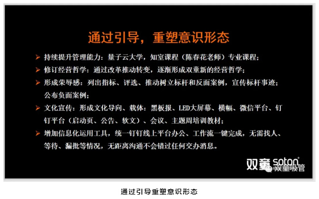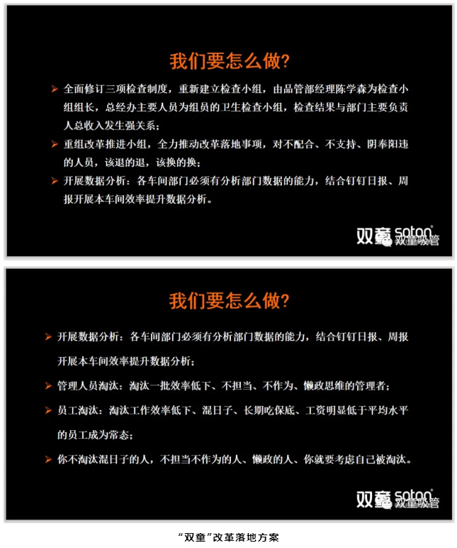 在樓仲平分享結(jié)束后,總經(jīng)理李二橋和大家分享了全面圍繞提升組織效率而展開(kāi)的改革落地方案,包括重建“雙童”改革小組和安全衛(wèi)生秩序檢查小組、形成崗位競(jìng)爭(zhēng)推動(dòng)優(yōu)勝劣汰、推動(dòng)車(chē)間數(shù)據(jù)分析能力、全面做好改革宣傳工作和文化引導(dǎo)工作、結(jié)合線上辦公平臺(tái)提升企業(yè)信息化水平等,在企業(yè)內(nèi)部建立起“以奉獻(xiàn)者為先、以?shī)^斗者為本”的新時(shí)代價(jià)值觀!