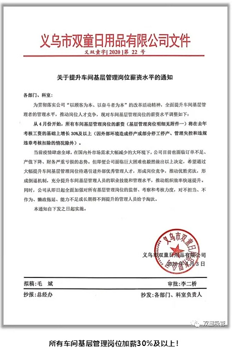 在危機裁員降薪風潮盛行的當下,恰恰是我們推動組織變革的好時機。所以,“雙童”借力于這樣一個機會,發(fā)布了加薪文件,給所有車間基礎管理崗位加薪30%及以上!也希望通過此舉引進更多的優(yōu)秀管理人才,實現(xiàn)優(yōu)勝劣汰,從而激發(fā)組織中每個員工的積極性。
