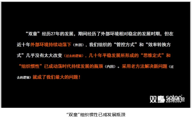 此外,我們還認識到,疫情危機后,外部環(huán)境的動蕩性將持續(xù)加劇,過去的邏輯對未來逐漸失效,“雙童”幾十年平穩(wěn)發(fā)展所形成的“組織慣性”已經(jīng)成為了持續(xù)發(fā)展的瓶頸,因此,“雙童”積極推動組織做出改變。