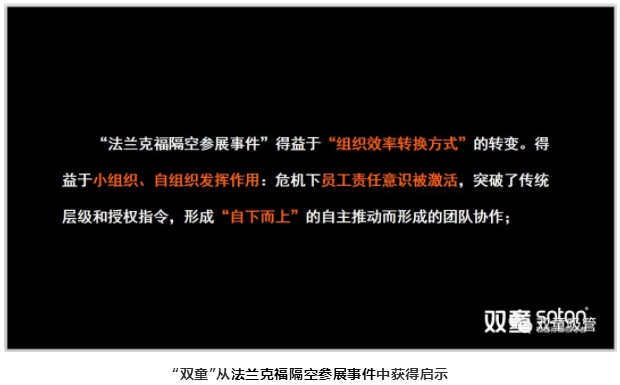 在這個過程中,組織效率發(fā)生了轉變,從以往的“要你做”,變成了現(xiàn)在的“我要做”,突破了指令的授權,實現(xiàn)了團隊的協(xié)作??梢哉f如果“雙童”沒有進行組織轉變,這樣的事情就不太可能發(fā)生。