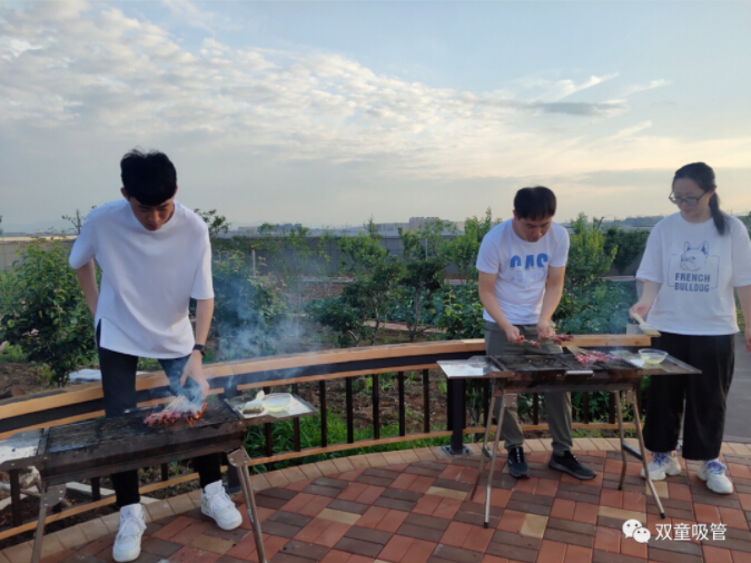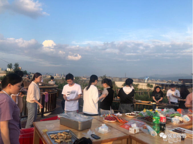 在“屋頂池塘”邊就是果樹下的燒烤平臺啦!燒烤區(qū)的同事們默默地奉獻著,炙熱的炭火,食物開始滋滋冒油,顏色漸轉焦黃,空氣彌漫著誘人因子,令人垂涎三尺……