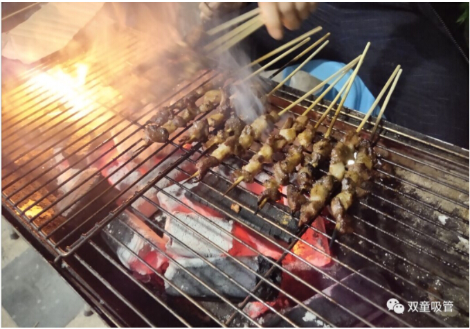 大伙手上的肉串還沒吃完,“燒烤小販”們已經笑瞇瞇地把新烤好的肉串奉上了,吃都來不及,這是什么節(jié)奏!
