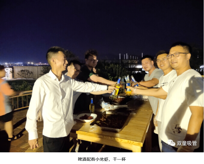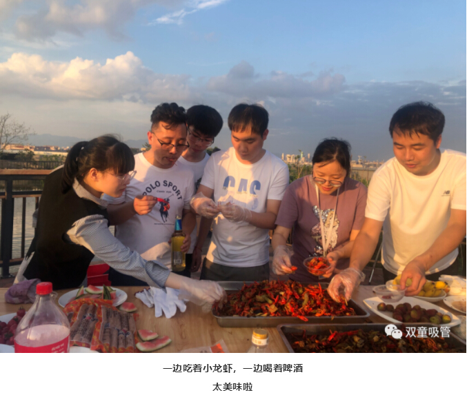 伴隨著香味,同事們齊聚在燒烤平臺,大盆吃菜,大口喝酒。小龍蝦配著啤酒,吃著現(xiàn)釣現(xiàn)燒的魚,真是美滋滋!