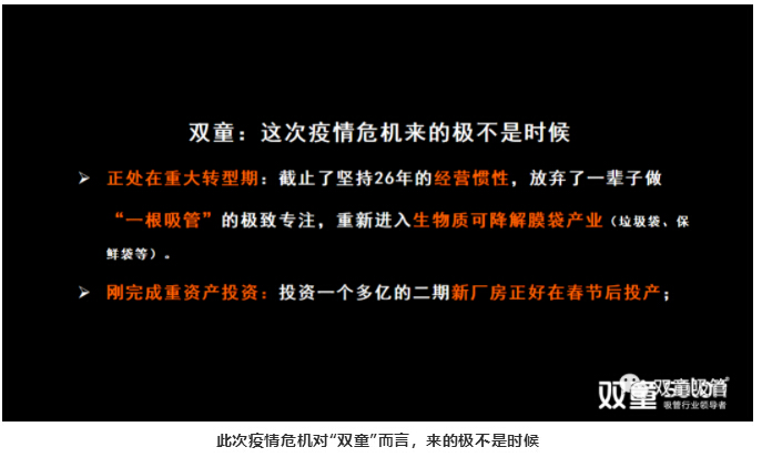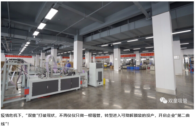 面對(duì)此次疫情危機(jī)對(duì)“雙童”帶來的巨大影響和挑戰(zhàn),“雙童”在堅(jiān)守實(shí)業(yè)的同時(shí)選擇擁抱變化,突破固有思維,不再僅僅只做一根吸管,堅(jiān)持發(fā)展企業(yè)“第二曲線”轉(zhuǎn)型投產(chǎn)于生物質(zhì)可降解膜袋!