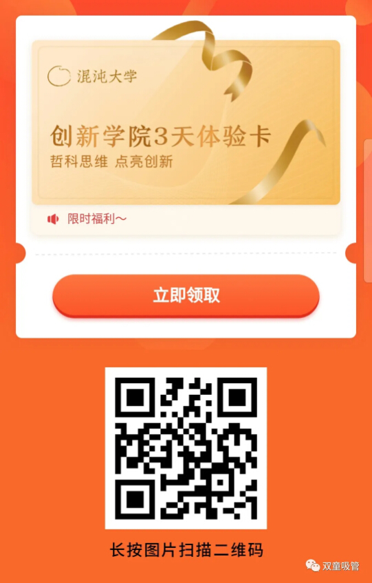 如果你還沒有聽說過混沌,如果你還持觀望態(tài)度,沒關(guān)系,我們?yōu)榇蠹覡幦〉搅嘶煦绱髮W最核心項目——創(chuàng)新學院的三天免費體驗卡,只要你掃碼下圖,即可享受為期3天的創(chuàng)新學院學籍!