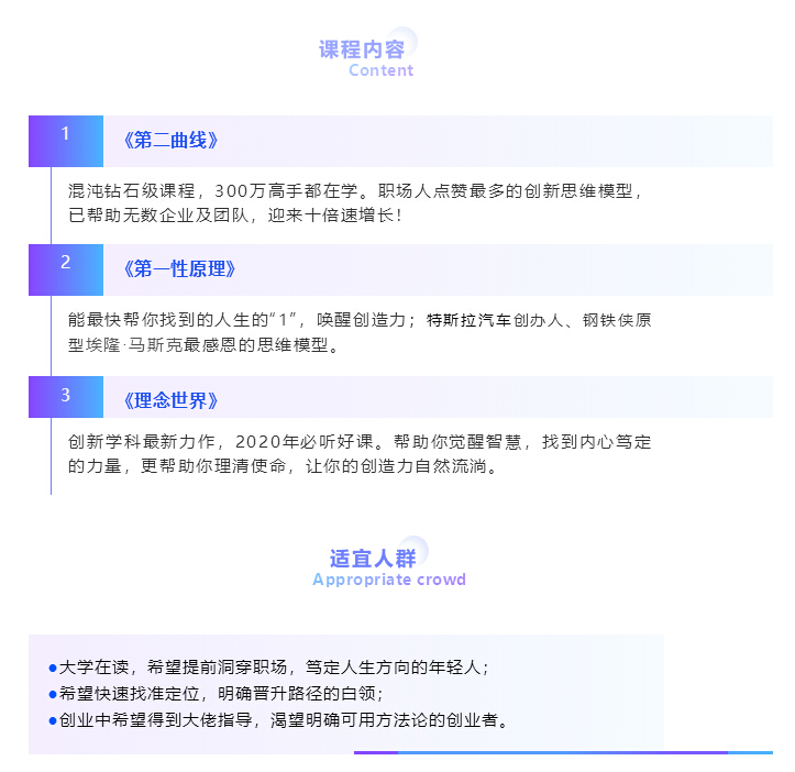 看到這里,相信你已經(jīng)對(duì)這些課程有了一定的了解,如果你是這些人群當(dāng)中的一員,如果你想有所改變,那就趕快掃碼體驗(yàn)吧!300萬創(chuàng)新者邀你同行,找到“1”,一秒看清本質(zhì),即刻開掛。