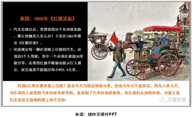 實(shí)際上,這就是“經(jīng)驗(yàn)”在作祟。我們現(xiàn)代人之所以覺(jué)得《紅旗法案》很可笑,是建立在我們對(duì)如今汽車(chē)的認(rèn)知經(jīng)驗(yàn)上。而當(dāng)時(shí)的英國(guó)人則是建立在對(duì)當(dāng)時(shí)盛行的馬車(chē)的認(rèn)知經(jīng)驗(yàn)上。