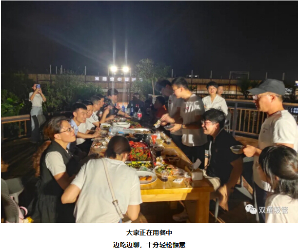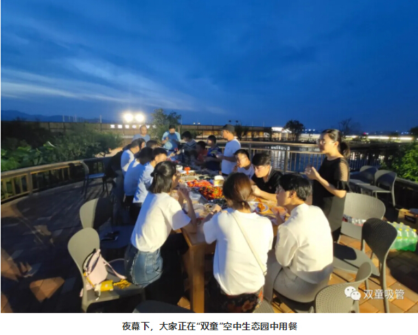 此次活動(dòng)的晚餐安排在“雙童”空中生態(tài)園,隨著夜幕降臨,濃濃夜色給就餐氛圍添加了一絲浪漫,伴隨著夜幕下的美景,大家邊吃邊聊,相處甚是融洽!