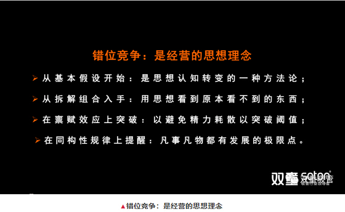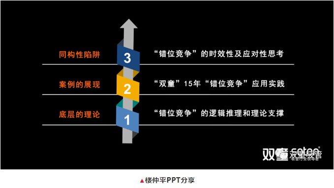 樓仲平從基本假設(shè)開始,用邏輯推理的方式一層層推進,分享了“雙童”15年“錯位競爭”的應(yīng)用實踐案例,“錯位競爭”的邏輯推理和理論支撐,從而引導(dǎo)大家深入理解錯位競爭是經(jīng)營的思想理念,是創(chuàng)新思維的方法論。