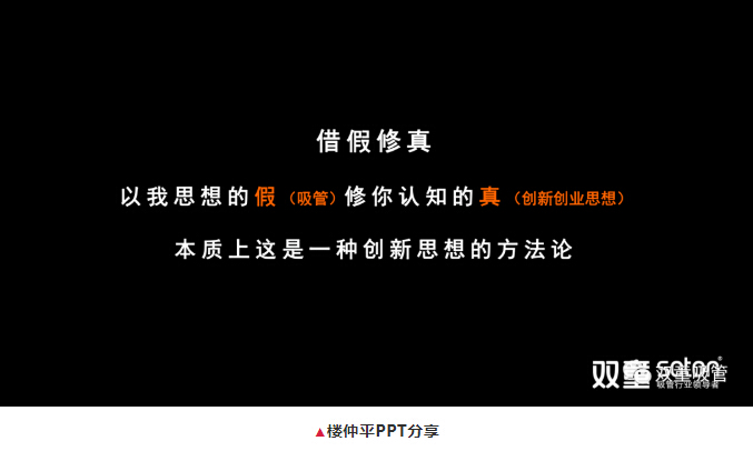在整場課程的分享中,樓仲平始終從思維通道上展開分享,引導(dǎo)大家一定要學(xué)會“借假修真”,也就是以樓仲平思想的假(吸管)修同學(xué)們在認(rèn)知上的真(創(chuàng)新創(chuàng)業(yè)思想)。