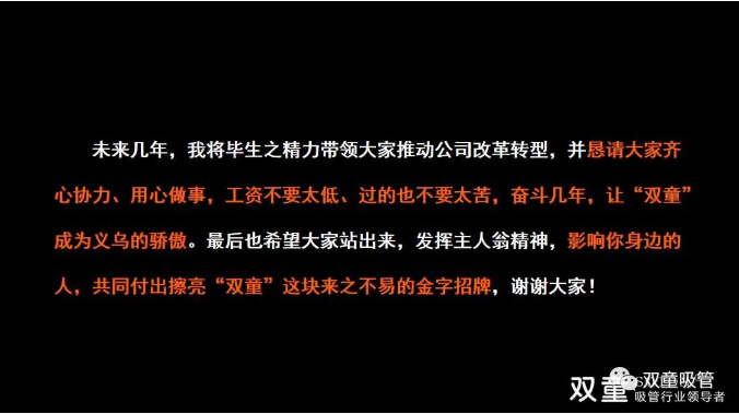最后,樓仲平鄭重和大家承諾:未來幾年 ,我將帶領(lǐng)大家推動公司改革轉(zhuǎn)型,希望大家齊心協(xié)力,用心做事,從而讓大家在付出血汗后,工資不會太低,過的不會太苦,少受委屈,獲得尊重。我會盡心盡力鼓勵你們,推動你們,助長你們,我們共同來支撐“雙童”走向未來!