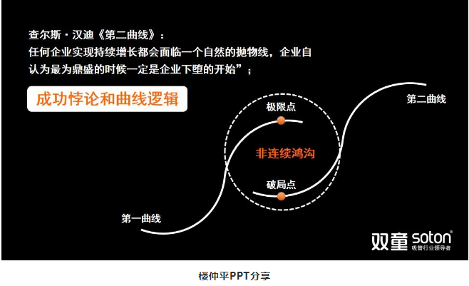 首先,樓仲平引用查爾斯·漢迪《第二曲線》:“任何企業(yè)實現(xiàn)持續(xù)增長都會面臨一個自然的拋物線,企業(yè)自認為最為鼎盛的時候一定是企業(yè)下墮的開始”!
