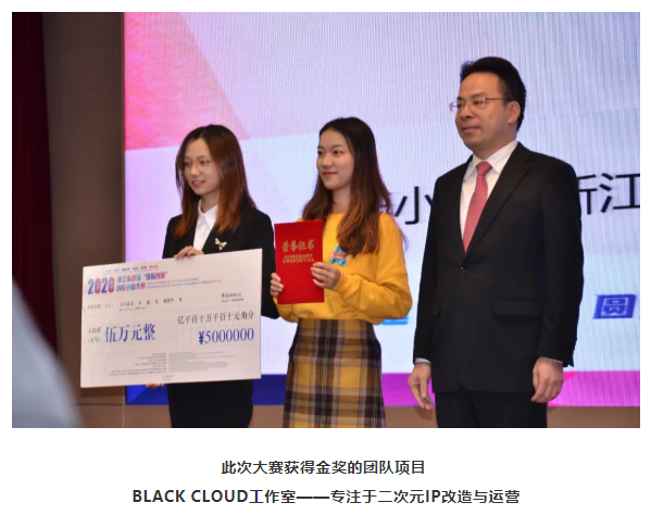 憑借超力強(qiáng)的實(shí)力水準(zhǔn),最終,程佳瑩、高田曜、王涵譽(yù)、黃雯靜、丁綺、柯銘穎團(tuán)隊(duì)的項(xiàng)目《BLACK CLOUD工作室——專注于二次元IP改造與運(yùn)營(yíng)》榮獲本次大賽的金獎(jiǎng),并領(lǐng)取了5萬(wàn)元參賽獎(jiǎng)金。