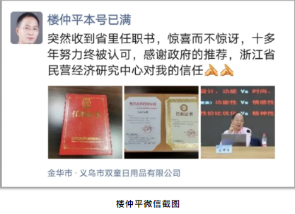 好消息!近日,“雙童”樓仲平被浙江省民營經(jīng)濟(jì)研究中心聘請為副主席,以后將對我們浙江省的民營經(jīng)濟(jì)發(fā)展做更多工作和貢獻(xiàn),也能更好代表我們浙江企業(yè)主發(fā)聲提議,爭取推動浙江民營經(jīng)濟(jì)更好的發(fā)展!