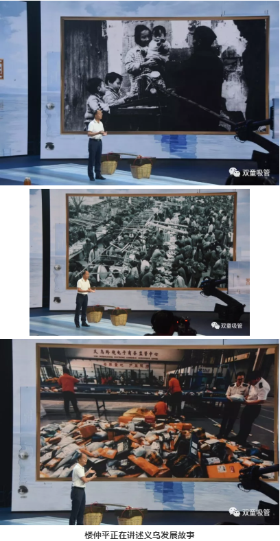 在節(jié)目現(xiàn)場(chǎng),“雙童”樓仲平也帶來(lái)了許多精彩的照片。其中,開場(chǎng)照片便是義烏這座城市的對(duì)比照片。通過(guò)挑貨郎與義烏小商品城開展全球電商的照片對(duì)比,樓仲平講述了義烏如何從貧瘠落后的小縣城發(fā)展為全球最大的小商品集散中心的故事……