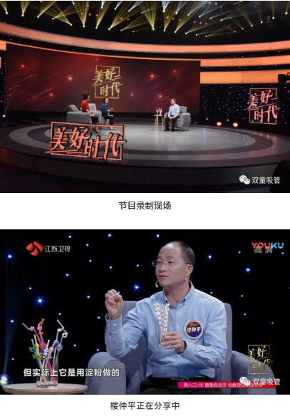 在“雙童”樓仲平上場后,主持人趙丹軍就被桌子上的各類吸管所吸引啦!樓仲平也向在場觀眾介紹了美觀環(huán)保的可降解吸管和極具特色的創(chuàng)新吸管。