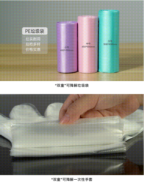 為配合國家產(chǎn)業(yè)政策向生物質(zhì)可降解材料方向轉(zhuǎn)變,“雙童”也重磅推出了可降解膜袋、可降解購物袋等膜袋類產(chǎn)品。