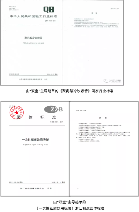 而且,從標(biāo)準(zhǔn)方面而言,“雙童”不僅主導(dǎo)制定了聚丙烯吸管行業(yè)的行業(yè)標(biāo)準(zhǔn)、國家標(biāo)準(zhǔn)和國際標(biāo)準(zhǔn),還在2014年就主導(dǎo)起草了《聚乳酸冷飲吸管》國家行業(yè)標(biāo)準(zhǔn),2019年主導(dǎo)起草了《一次性紙質(zhì)飲用吸管》浙江制造團(tuán)體標(biāo)準(zhǔn),緊握住了吸管行業(yè)的規(guī)則制定權(quán)和行業(yè)話語權(quán)!
