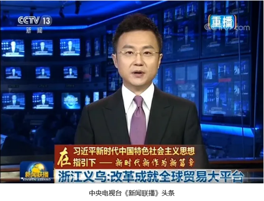 2019年12月7日,中央電視臺《新聞聯(lián)播》頭條以《【在習近平新時代中國特色社會主義思想指引下——新時代 新作為 新篇章】浙江義烏:改革成就全球貿(mào)易大平臺》為標題,聚焦義烏改革發(fā)展。被譽為世界小商品之都的浙江義烏,銳意改革,轉(zhuǎn)型突破,從一個靠著紐扣、皮筋等不起眼的小物件起家的小商品市場,成為我國國際貿(mào)易綜合改革豐碩成果的展示區(qū)。