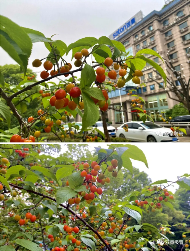 看!“雙童”的櫻桃樹上綴滿了櫻桃果,茂密的櫻葉也遮蓋不住紅橙相間的果實。“小燈籠”們散發(fā)出陣陣誘人果香,讓人不禁胃口大開,口水直流!