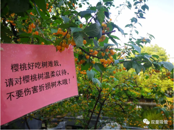 咦?櫻桃樹上除了有櫻桃,還有一塊牌子呢!原來,為了讓櫻桃樹更好的生長,“雙童人”在每棵櫻桃樹上都掛了標語牌,提醒大家在摘櫻桃時不要折損傷害櫻桃樹。