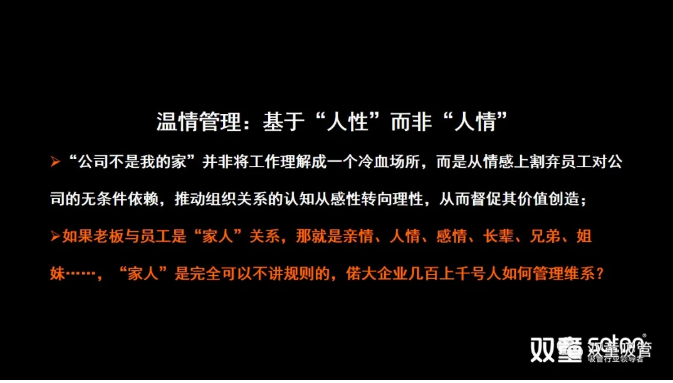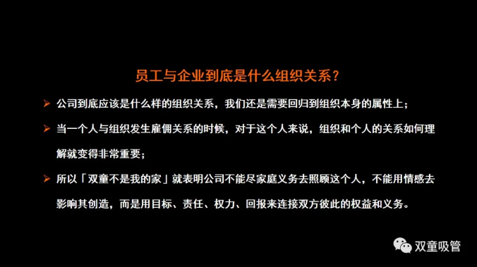 需要強(qiáng)調(diào)的是,我們推行“雙童不是你的家”,并非是將“雙童”營造成一個(gè)冷血場所,而是讓員工從情感上割棄對公司的無條件依賴,將對組織的認(rèn)知從感性轉(zhuǎn)向理性,運(yùn)用職業(yè)化思維引導(dǎo)員工價(jià)值創(chuàng)造。
