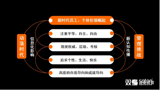 同時(shí),大量在互聯(lián)網(wǎng)信息時(shí)代下成長起來的90后、00后員工進(jìn)入工作崗位。他們的思維與以往的老一代有所不同:他們有著高度的自我導(dǎo)向和成就導(dǎo)向,更加注重平等、自主和自由,蔑視權(quán)威、層級和考核。這表示我們進(jìn)入了一個(gè)體價(jià)值的崛起的時(shí)代。