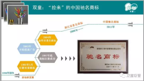 “雙童吸管”從1995年開始的品牌塑造,基本是五年一個階段,前五年基本沒有聲音,屬于積累期;第二個五年的2000年獲“義烏名牌”,2003年獲“金華市著名商標(biāo)”和“金華名牌”。第三個五年從2005年之后分別獲“浙江省著名商標(biāo)”、“浙江省名牌產(chǎn)品”、“浙江省知名商號”和“浙江省綠色企業(yè)”等省級榮譽(yù)稱號。一直到第四個五年之初的今年,終于獲國家工商總局的“中國馳名商標(biāo)”認(rèn)定。